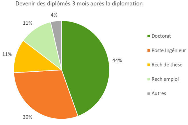 Les diplômés choisissent entre un doctorat (chercheur, enseignant-chercheur, cadre R&D) ou une insertion professionnelle sur des postes d'ingénieur, facilitée par l’alternance.