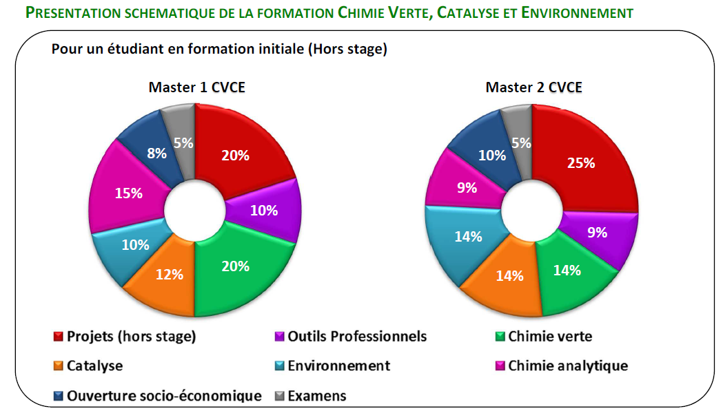 L’enseignement est conçu pour permettre aux étudiants d’approfondir autant les aspects fondamentaux que les aspects appliqués et industriels, importants dans le domaine de la chimie verte, la catalyse et l’environnement. Les enseignements sont organisés pour développer l’autonomie des étudiants via des activités de mise en situation et de gestion de projet de recherche pour faciliter leur insertion professionnelle (stages, alternance, projets). Cette formation de haut niveau s’appuie sur une équipe d’enseignants chercheurs reconnus internationalement dans leurs domaines de compétences et d’intervenants industriels experts dans les compétences « métier ».