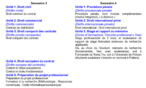 Ce parcours conduit à l’obtention d’un double diplôme, français de Master et italien de Laurea magistrale, délivré en partenariat international avec l’Université de Roma Tre. Le Master 1 se déroule en Italie pour les étudiants de l’Université de Poitiers et en France pour les étudiants de l’Université de Roma Tre ; le Master 2 se déroule en France puis en Italie pour tous les étudiants. Lesquels séjournent donc trois semestres sur quatre à l’étranger, ce qui leur permet de découvrir et de s’ouvrir à une autre culture, y compris juridique. Lors du semestre 3 à l’Université de Poitiers, la formation est intégralement mutualisée avec le parcours de Master 2 Contrats en droit français et européen.